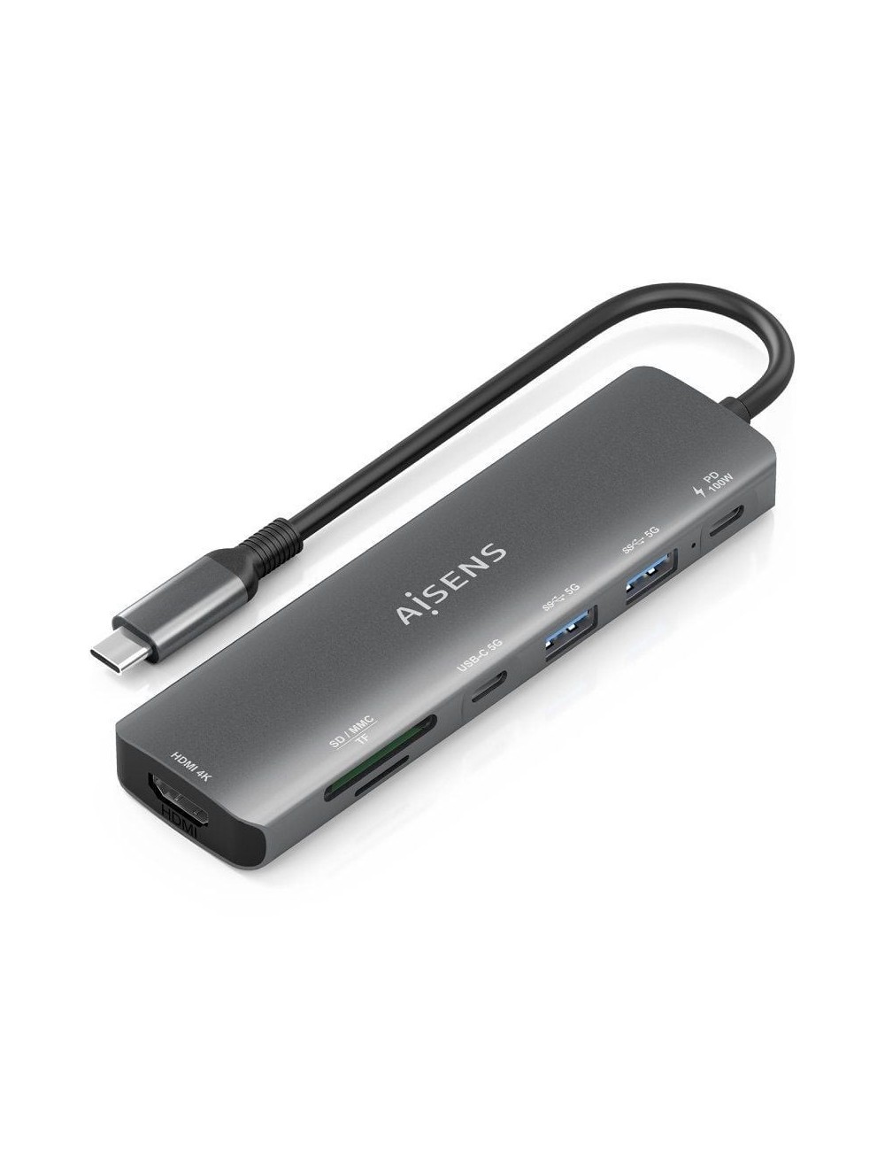 AISENS - USB-C DOCK 7 EN 1, USB-C A 1xHDMI, 2xUSB-A, 1xUSB-C, 1xUSB-C PD 100W, 1xSD, 1xMICRO SD, GRIS, 15CM