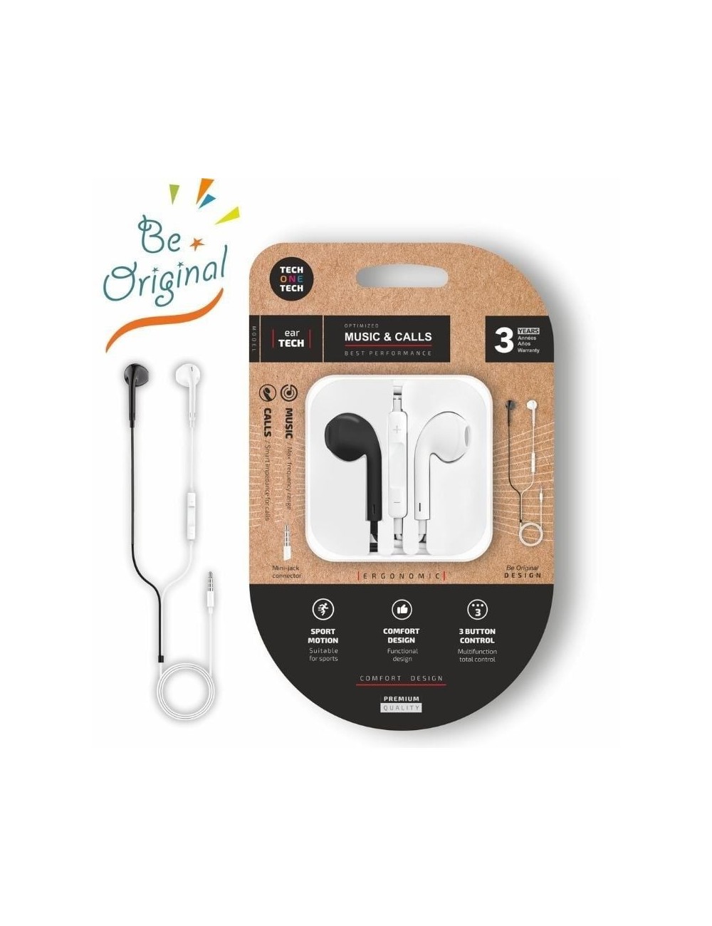 EarTECH ergonómicos, sonido estéreo, con micrófono, controles de volumen y tercer botón multifunción.