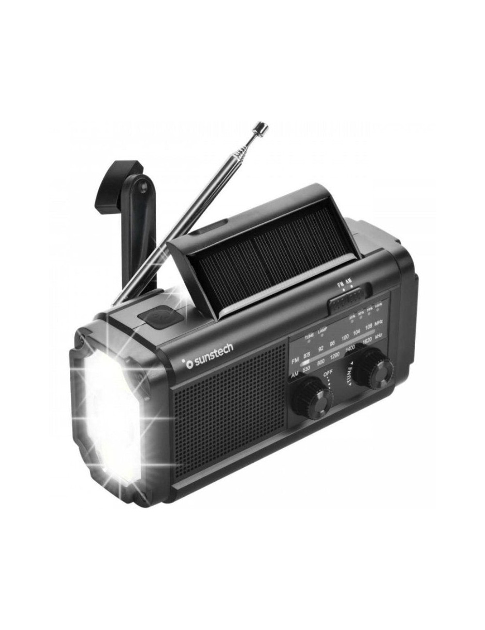 Métodos de alimentación: Batería interna, carga por USB-C, panel solar y manivela dínamo
